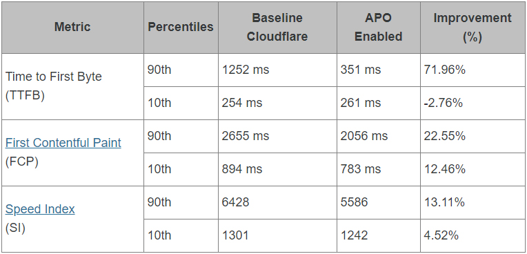 In addition to faster TTFB and additional caching of third-party fonts, APO also improves the performance of the First Contentful Paint and Speed Index of websites. By caching additional third-party fonts, Cloudflare API can reduce the time it takes to fetch that content.